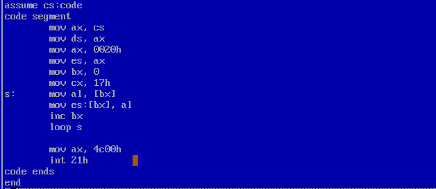 (1)第一空应填 CS ,因为要将程序自身代码内容复制到0:200开始的内存单元处,而程序指令的起始地址由CS:IP给出,故填CS。