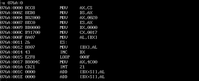 第二空应填17H,采用debug对代码进行调试(第二空暂时填0),计算出整个代码共001CH个字节,减去最后两行代码占用的字节数0005H,故填17H。