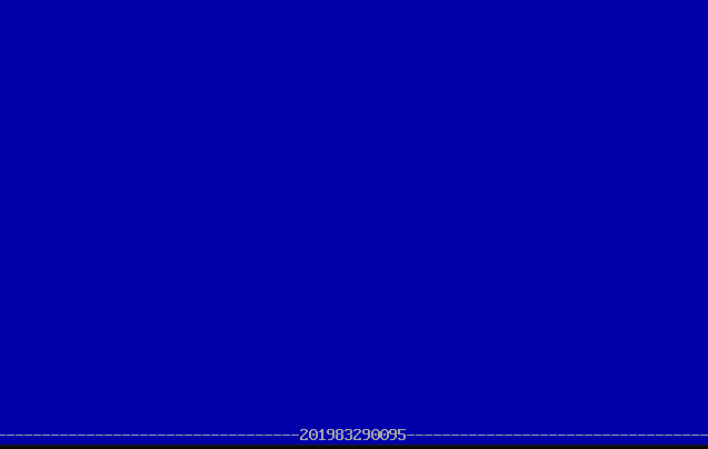 1 assume cs:code, ds:data 2 3 data segment 4 stu_no db '201983290095' 5 len = $ - stu_no 6 data ends 7 8 code segment 9 start: 10 mov ax, data 11 mov ds, ax 12 13 mov ax, 0b800h 14 mov es, ax 15 mov si, 0 16 mov bx, 0 17 mov cx, 1920 ;80*24=1920个字符 18 19 s1: mov ah, 00010111b ;蓝底白字 20 mov es:[di], ax ;用空格填充前24行 21 add di, 2 22 loop s1 23 24 mov cx, 34 25 s2: mov ah, 00010111b 26 mov al, 45 27 mov es:[di], ax ;第25行前34个字符填充"-" 28 loop s2 29 30 mov cx, 12 31 s3: mov ah, 00010111b 32 mov al, ds:[bx] 33 mov es:[di], ax ;中间12个字符填充学号 34 inc bx 35 add di, 2 36 loop s3 37 38 mov cx, 34 39 s4: mov ah, 00010111b 40 mov al, 45 41 mov es:[di], ax ;第25行后34个字符填充"-" 42 add di, 2 43 loop s4 44 45 mov ax, 4ch 46 int 21h 47 code ends 48 end start