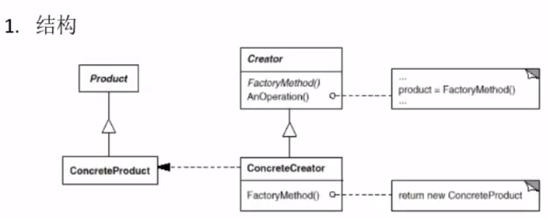 目的是大批量的生产某种对象,有一个create,用来创建对象,有一个工厂方法ConcreteCreator,这个方法会判断工厂想要创建什么样的产品,于是就生产出对应的产品,