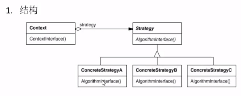 它有一个基类Strategy,这是策略模式所要求的通用的接口,也就是算法接口,所有的它的策略都要实现相同的函数,然后具体的要有一个Context来实现这个策略,根据我们传进去的策略不同,那么我们都能实现某种效果,但是中间过程或者消耗是不一样的,