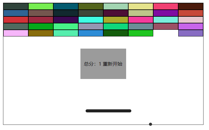 *{margin: 0;padding: 0;} /* 场景 */ #scence1{position: relative;height: 400px;width: 656px;border: 1px solid #333;top: 50%;left: 50%;margin-left: -300px;margin-top: 50px;} #scence{height: 400px;width: 656px;position:absolute;} /* 小砖块 */ .xzk{height: 20px;width: 80px;background: #888;border: 1px solid #000;position: absolute;left: 0;} /* 打击球 */ .dot{height: 10px;width: 10px;border-radius: 50%;background: #333;position: absolute;top: 340px;left: 300px;} /* 回弹的杆子 */ .gz{height: 10px;width: 150px;position: absolute;background: #222;border-radius: 10px;top: 350px;left: 270px;} /* 重新开始游戏 */ #reloadGame{height: 100px;cursor: pointer;width: 150px;background: rgba(55, 55, 55, .5);position: absolute;top: 50%;left: 50%;margin-top: -50px;margin-left: -75px;line-height: 100px;text-align: center;display: none;}
