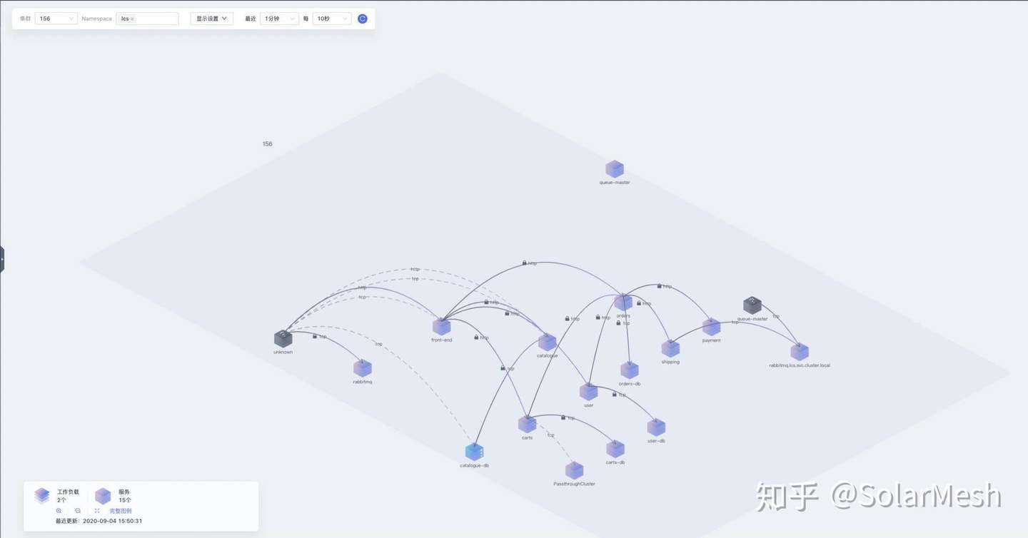 SolarMesh 通过捕获通信起止服务、网络协议、请求内容等数据,并基于捕获数据绘制以服务为节点的访问关系拓扑图,动态展示全局化的服务间实时通信状态。