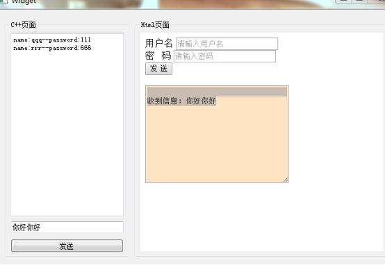 左侧为C++页面,右侧为嵌入的Html页面,通过按钮相互发送数据,对方均接收到正确数据,验证C++与Html本地开发可行性。
