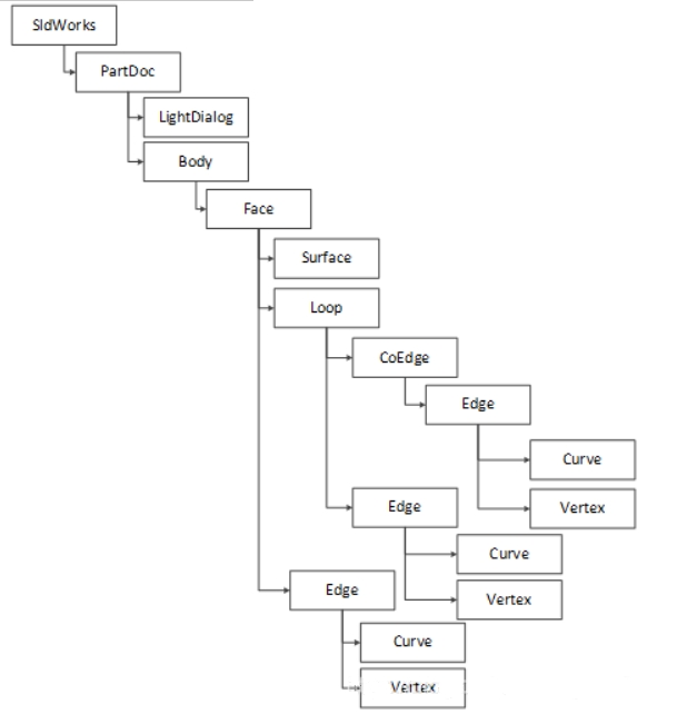 SOLIDWORKS的二次开发是建立在软件提供的API函数的基础上的,SOLIDWORKS的API对象结构是一个自上而下的多层树型网络结构,在二次开发过程中,COM编程允许SOLIDWORKS将实际的对象函数功能与外部世界联系,提供给设计人员开发使用,而VB.Net程序语言将COM编程的复杂性降低,使得设计人员在编译时,既可以在上层对象中寻找函数和方法,也可以面向子类对象调用其函数完成设计。