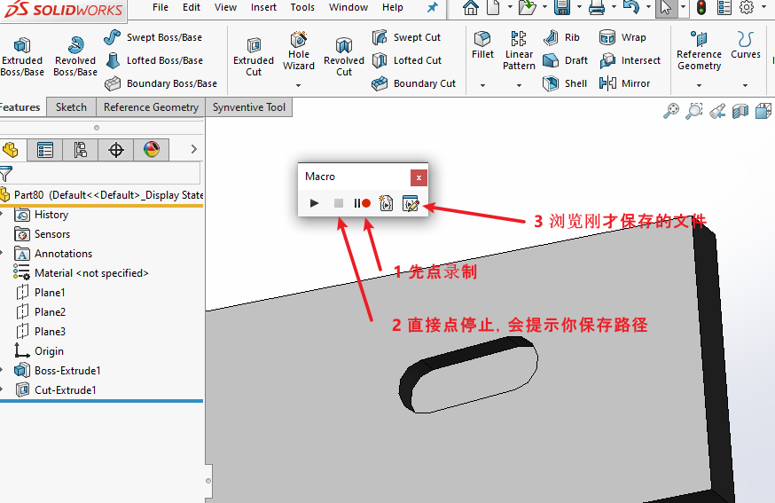 首先画一个矩形拉伸,然后做一个槽切除,并且名字一定要为Cut-Extrude1