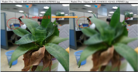 点击椭圆红框进行refocus,仅仅是指不会虚化此点景深平面,清晰度与单摄Main cam对着花盆拍照时此区域清晰度一致