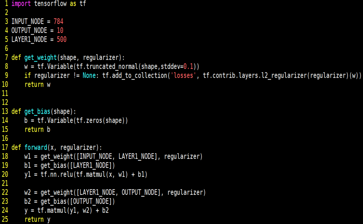 由上述代码可知,在前向传播过程中,规定网络输入结点为 784 个(代表每张输入图片的像素个数),隐藏层节点 500 个,输出节点 10 个(表示输出为数字 0-9的十分类)。由输入层到隐藏层的参数 w1 形状为[784,500],由隐藏层到输出层的参数 w2 形状为[500,10],参数满足截断正态分布,并使用正则化,将每个参