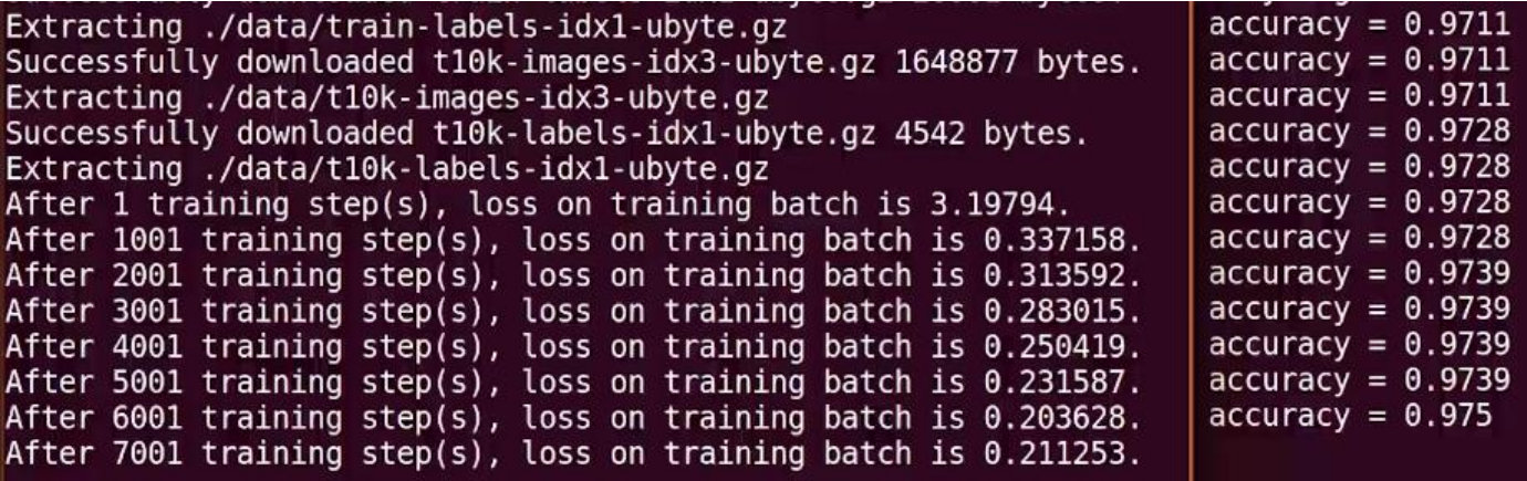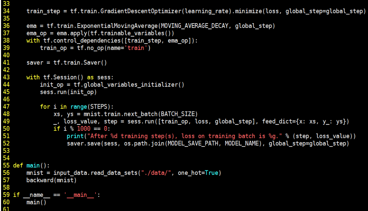 由上述代码可知,在反向传播过程中,首先引入 tensorflow、input_data、前向传播 mnist_forward 和 os 模块,定义每轮喂入神经网络的图片数、初始学习率、学习率衰减率、正则化系数、训练轮数、模型保存路径以及模型保存名称等相关信息。在反向传播函数 backword 中,首先读入 mnist,用 placeholder 给训练数据 x 和标签 y_占位,调用 mnist_forward 文件中的前向传播过程 forword()函数,并设置正则化,计算训练数据集上的预测结果 y,并给当前计算轮数计数器赋值,设定为不可训练类型。接着,调用包含所有参数正则化损失的损失函数loss,并设定指数衰减学习率 learning_rate。然后,使用梯度衰减算法对模型优化,降低损失函数,并定义参数的滑动平均。最后,在 with 结构中,实现所有参数初始化,每次喂入 batch_size 组(即 200 组)训练数据和对应标签,循环迭代 steps 轮,并每隔 1000 轮打印出一次损失函数值信息,并将当前会话加载到指定路径。最后,通过主函数 main(),加载指定路径下的训练数据集,并调用规定的 backward()函数训练模型。