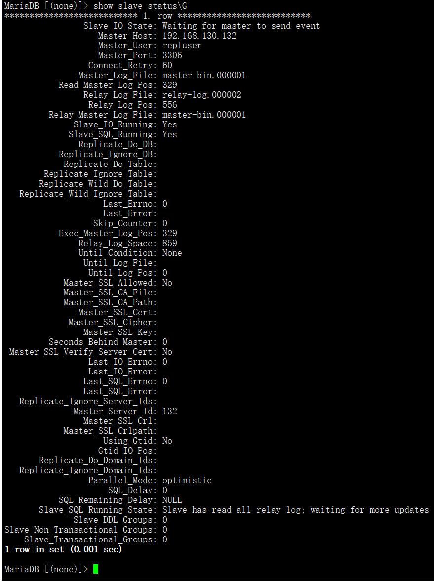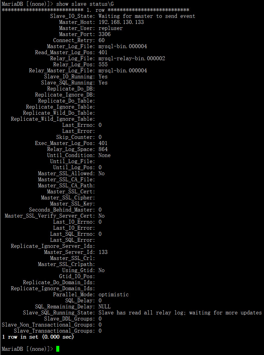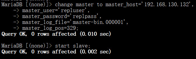 MariaDB [(none)]> grant replication slave on *.* to 'repluser'@'192.168.130.%' identified by 'replpass';