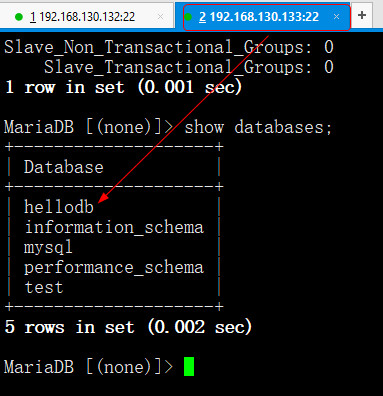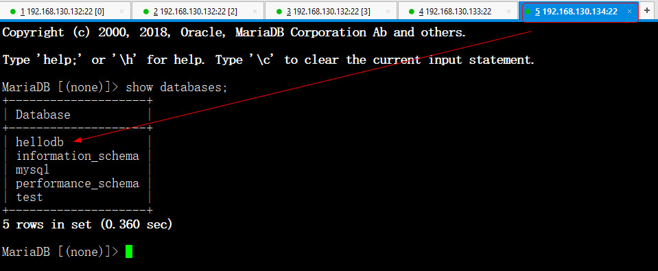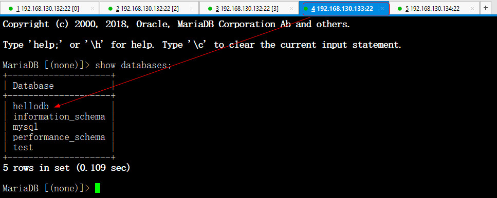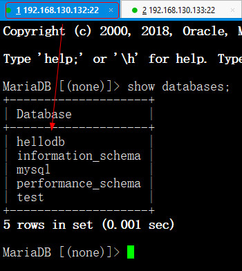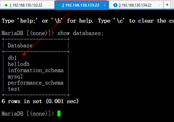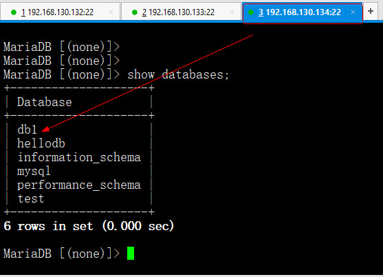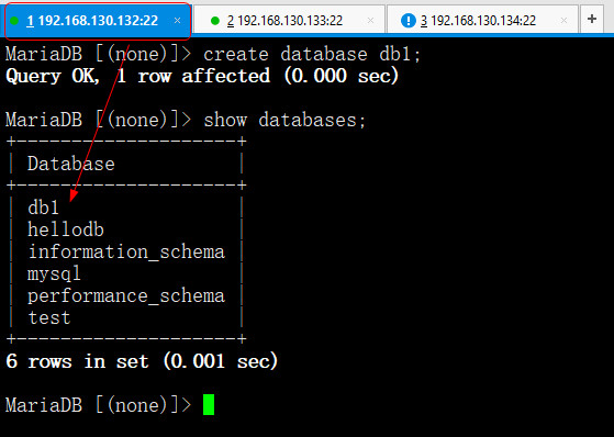 # 在主节点新建测试库db1,并在级联从节点,以及下属从节点上查看。