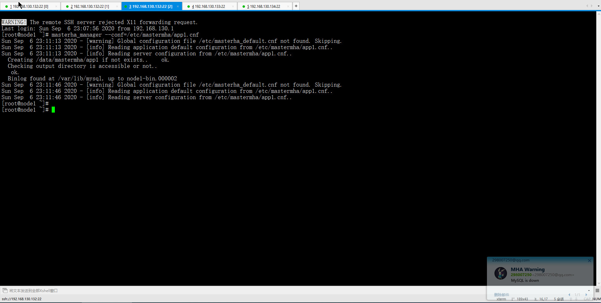 echo "MySQL is down" | mail -s "MHA Warning" ******@qq.com