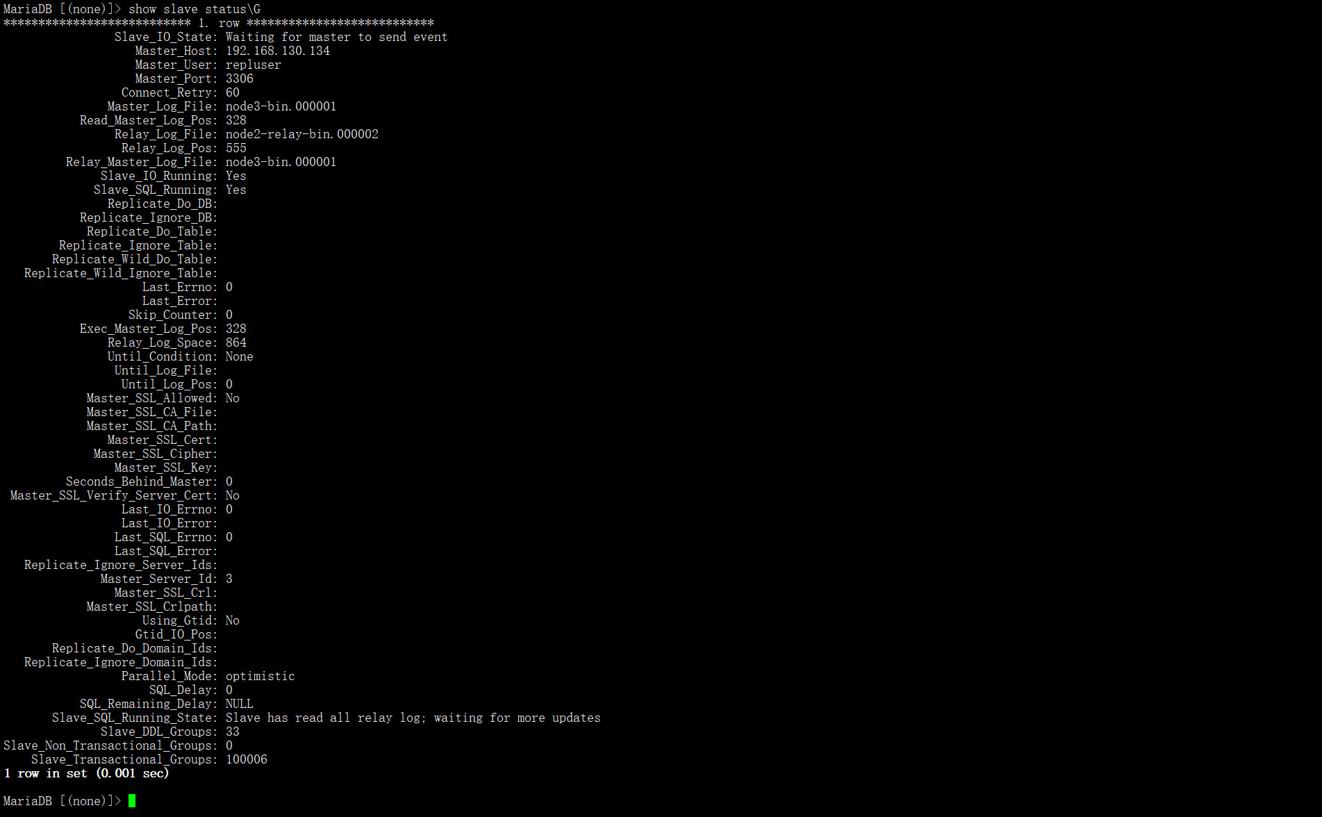 # 进入mariadb,使用有复制权限的用户账号连接至主节点。