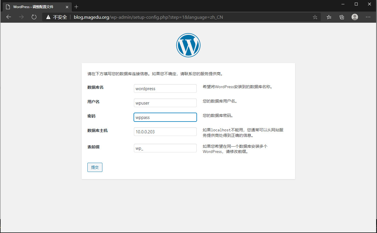 配制wordpress数据库信息。
