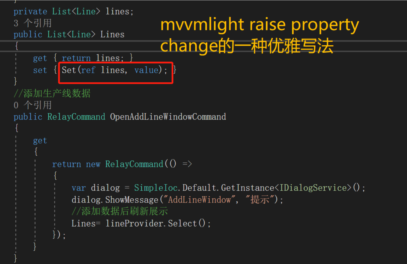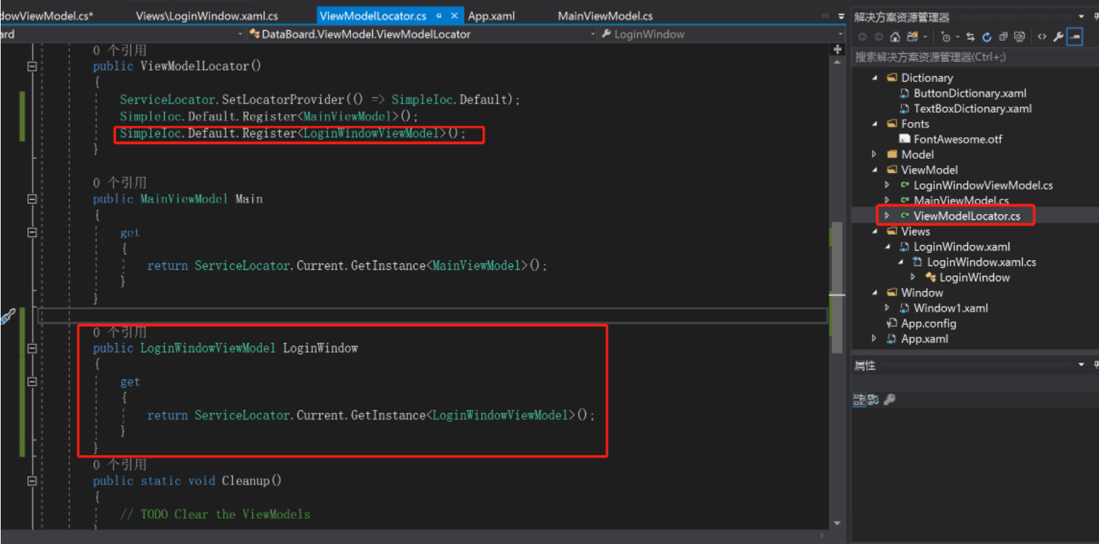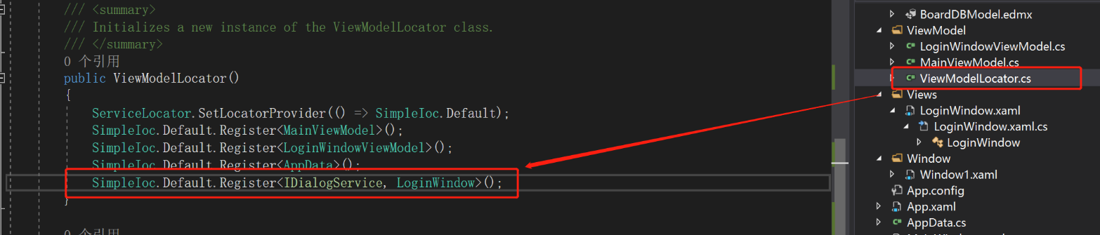 关于提示框,ShowMessageBox方法来自接口IDialogService。在view中LoginWindow的cs文件中,实现IDialogService接口。将IDialogService接口和实现它的LoginWindow注册进IOC,即红线所示。然后就可以被上图的SimpleIOC.Default.GetInstance<IDialogService>();获取实例了
