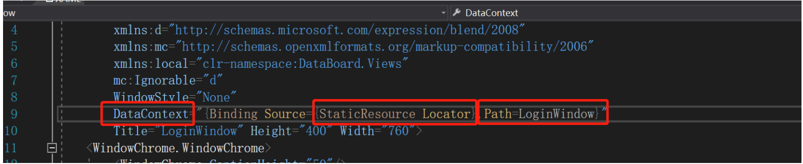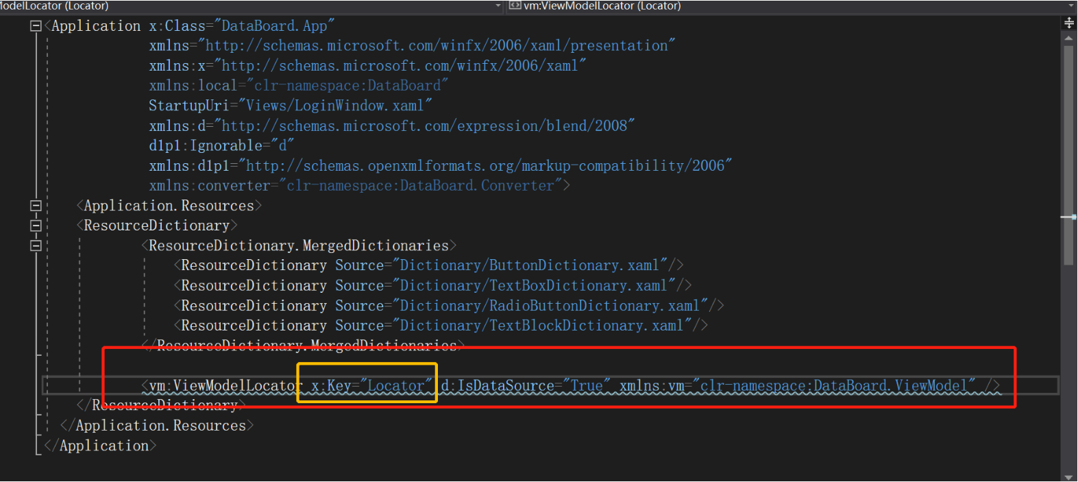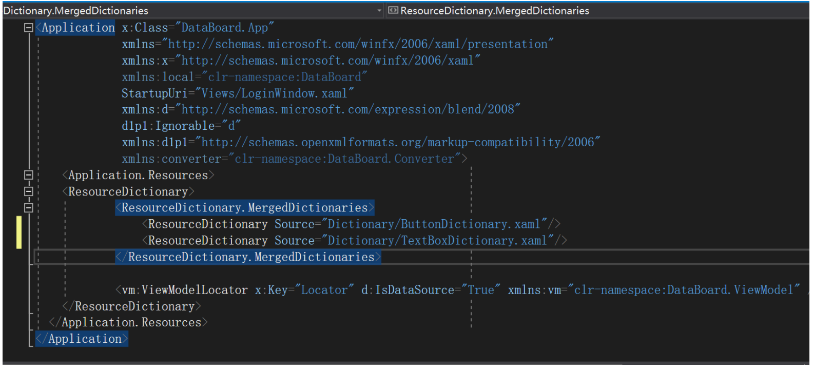 - 将ViewModelLoactor写入App.xml,这样子ViewModelLoactor就可以作为资源,以Locator的key值被调用
