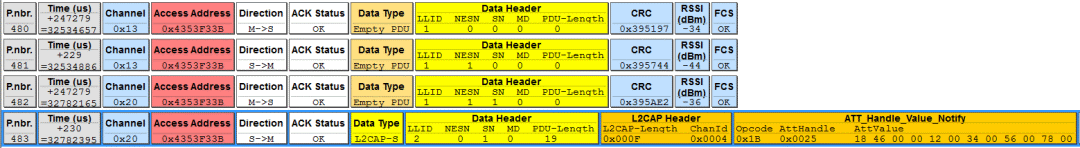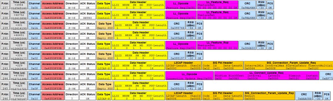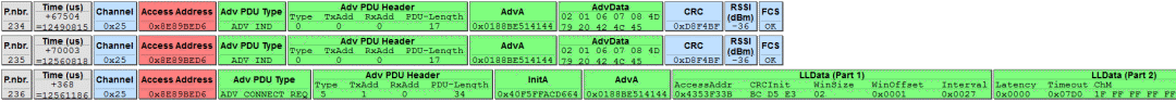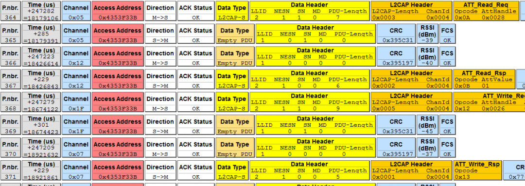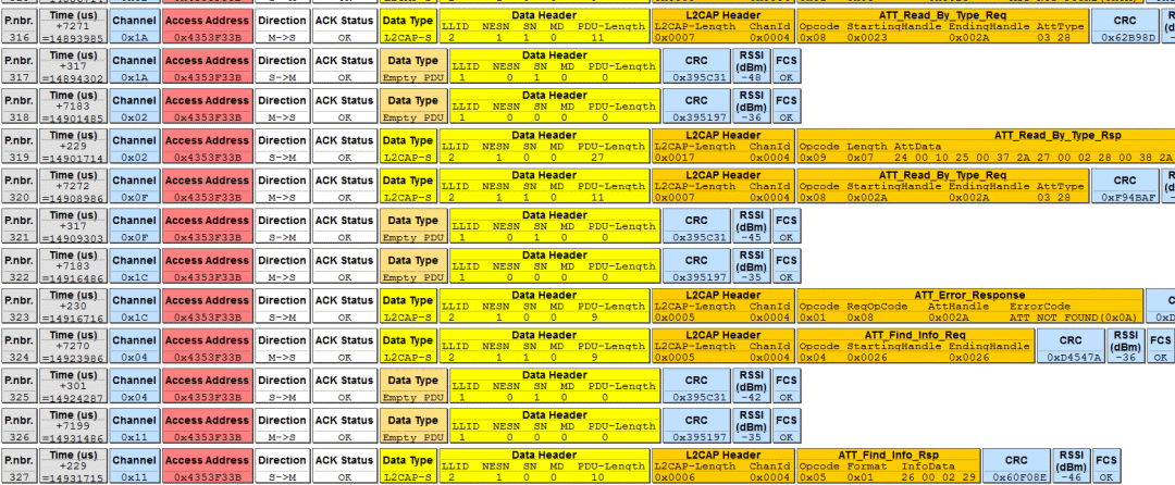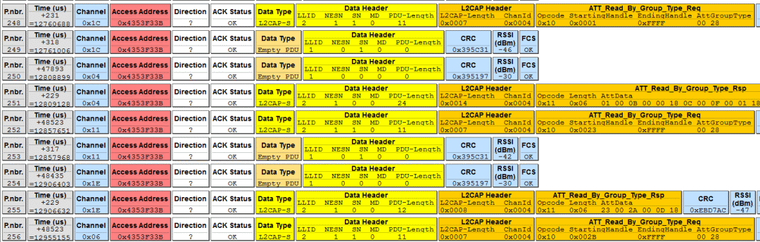 整个流程包括了广播通道上的PDU(广播和连接请求),以及数据通道上的PDU (L2CAP,ATT/GATT),后面具体章节将根据PDU类型来分析具体流程。