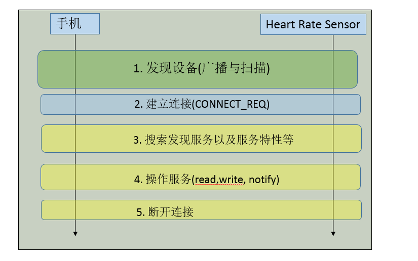 Heart Rate Sensor对外广播,手机扫描搜索周围设备,并在收到Heart Rate Sensor的广播数据后发起连接,连接成功后搜索其提供的服务,并发现HeartRate Sensor服务的特性和操作方法,进而获取心率监测。
