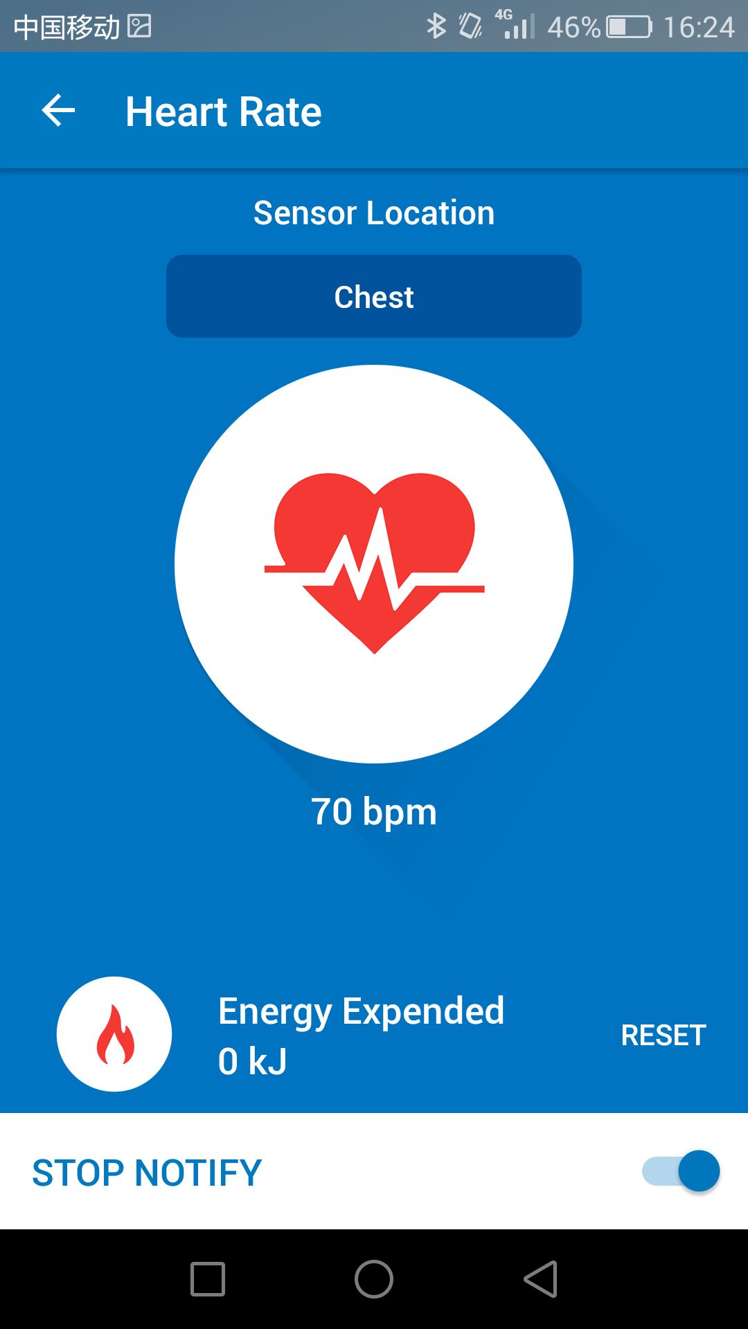 查看Heart Rate Service提供的服务和操作方法,可以看到,提供SensorLocation,HeartRate测量以及EnergyExpended功能,并且有一个STAR TNOTIFY开关。打开开关就能收到HeartRate Sensor通知的心率值,图中的70bpm
