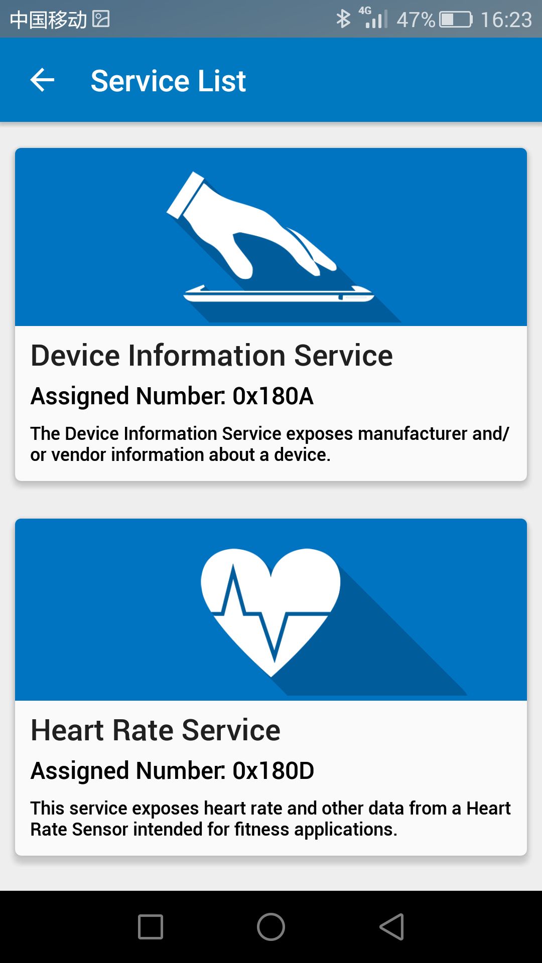 连接该设备,并搜索发现设备提供的服务,发现其提供两个服务:Heart Rate Service和Device Information Service