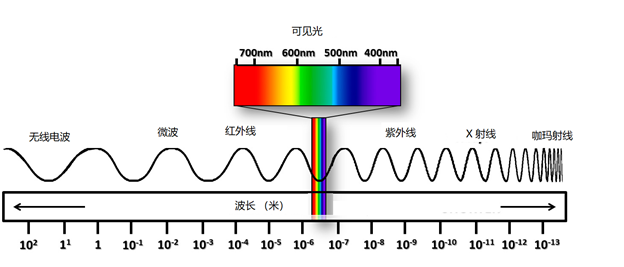比伽马射线波长更短的是宇宙射线(cosmic ray),人耳可听的声波从20Hz到20kHz,相应的波长从17m到17mm不等;人眼的可见光从深红色的760nm波长,到紫色的390nm波长。 2 无线电波无线电波是无线应用中使用广泛的一个频段,通常指波长为1毫米至100公里或频率为300GHz至3 kHz的电磁波,涵盖了从业余无线电到移动电话的所有频段,