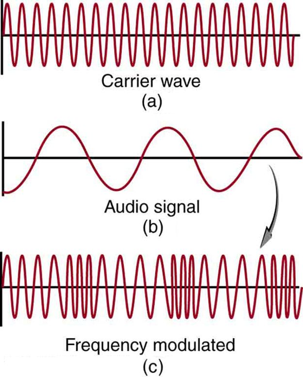 (a) 电台选择一个基本频率的载波。(b)待调频的音频信号。(c)载波的频率由音频信号调制而不改变其幅度。在这种情况下,具有无线电台的基本频率的载波在频率上被音频信号调制,从而产生振幅恒定但频率变化的波。 除三种基本调制方式以外,通过改进或者组合扩展出其他的调制方式,例如OFDM 5 频谱的使用