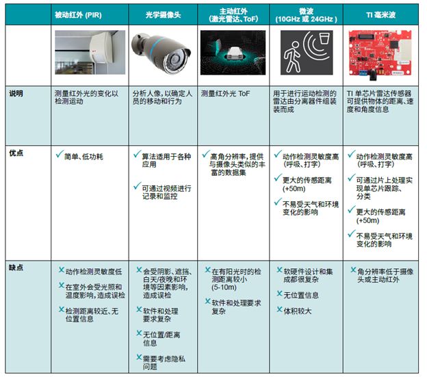 目前的占用及人员跟踪传感器所使用的技术包括:被动红外 (PIR)、光学摄像头、主动红外(如激光雷达和三维飞行时间(ToF))和 10GHz 至 24GHz 微波等。下图比较了这些技术并列出了它们的优缺点。
