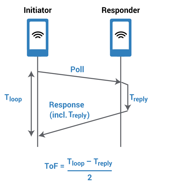 一旦配备了UWB无线电的设备(如智能手机,腕带或智能钥匙)进入另一台UWB设备的范围,这些设备便开始测距。通过在设备之间执行飞行时间(ToF)测量来完成测距。通过测量质询/响应数据包的往返时间来计算TOF。根据应用程序的类型(例如,在资产跟踪,设备本地化的情况下),移动式或固定UWB设备都会计算出设备的精确位置。如果设备正在运行室内导航服务,则需要知道其与固定UWB锚点的相对位置,并计算其在区域地图上的位置。