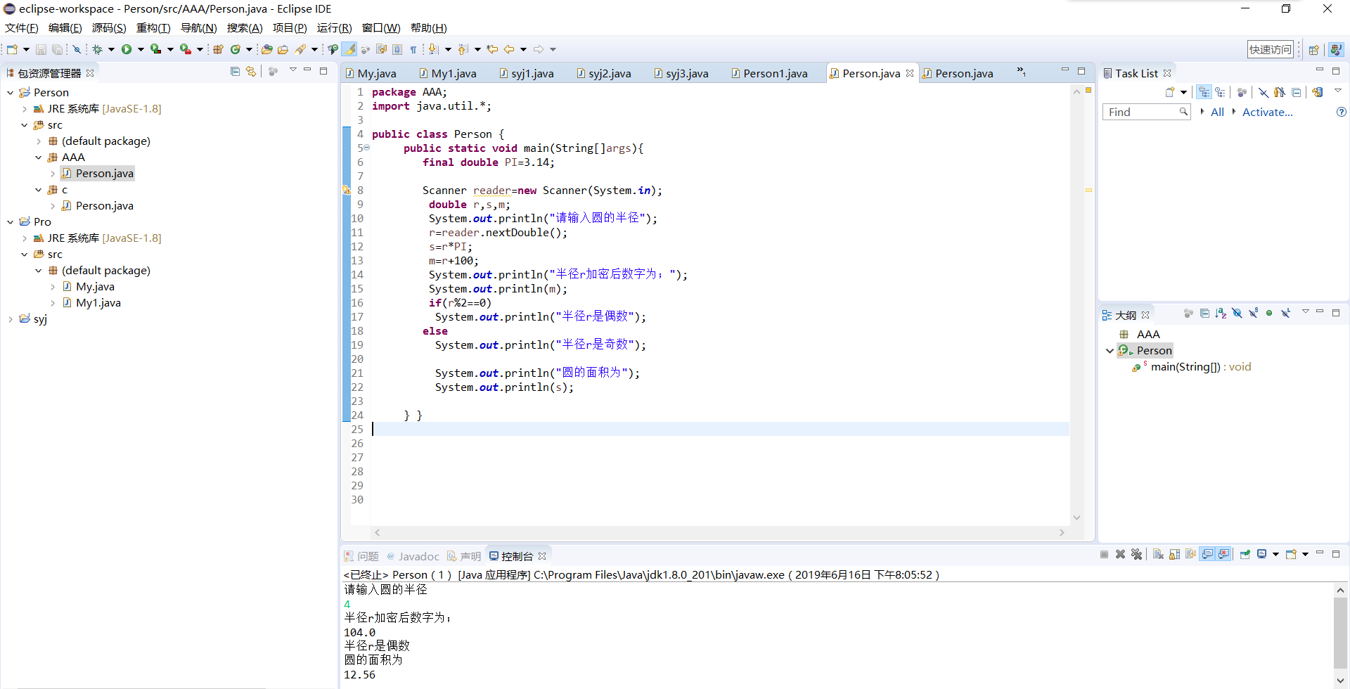 package AAA; import java.util.*; public class Person { public static void main(String[]args){ final double PI=3.14; Scanner reader=new Scanner(System.in); double r,s,m; System.out.println("请输入圆的半径"); r=reader.nextDouble(); s=r*PI; m=r+100; System.out.println("半径r加密后数字为;"); System.out.println(m); if(r%2==0) System.out.println("半径r是偶数"); else System.out.println("半径r是奇数"); System.out.println("圆的面积为"); System.out.println(s); } }