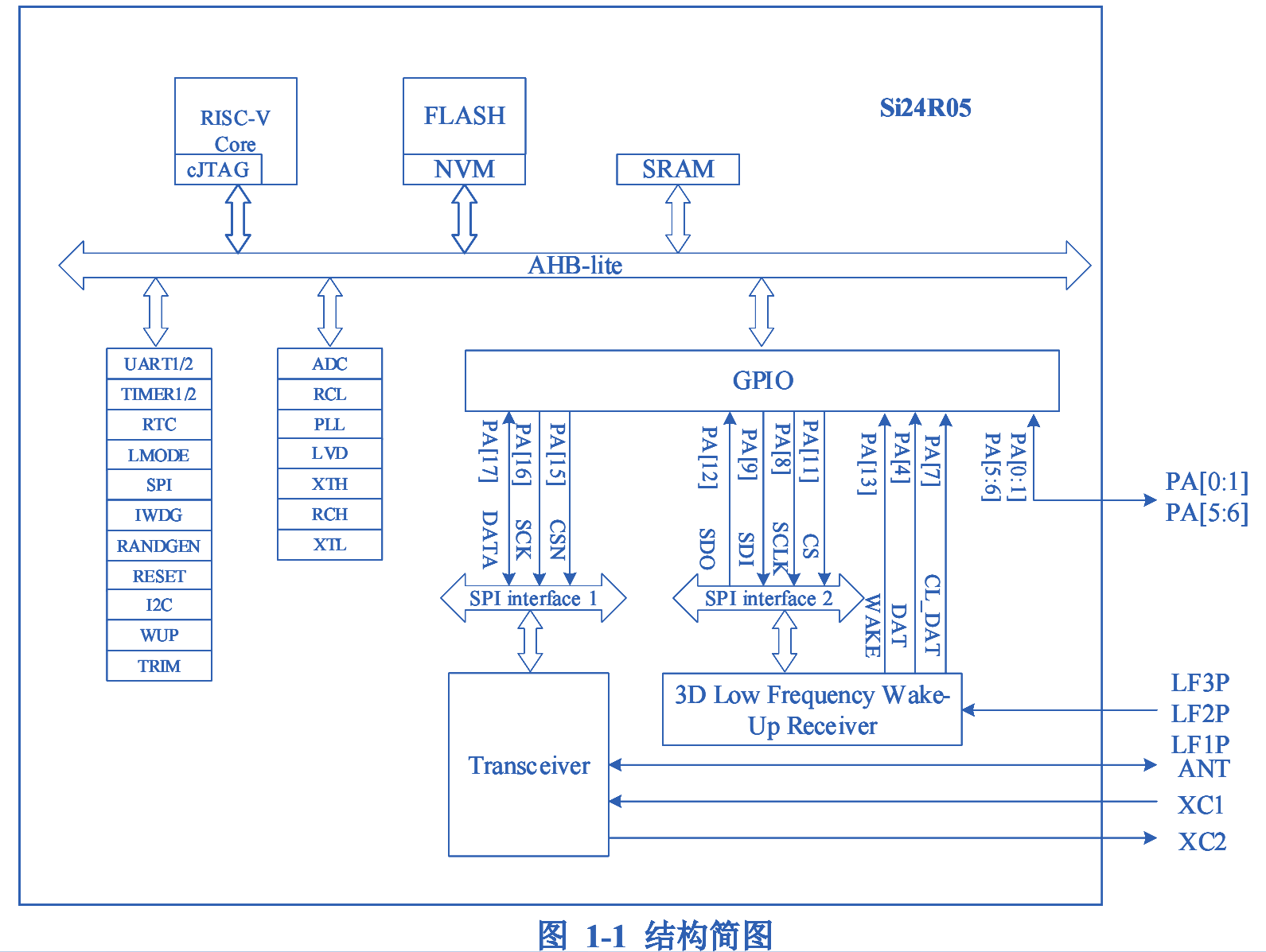 Si24R05是一款高度集成的低功耗SoC芯片,具有低功耗、Low Pin Count、宽电压工作范围,集成了13/14/15/16位精度的ADC、LVD、UART、SPI、I2C、TIMER、WUP、IWDG、RTC、无线收发器、3D低频唤醒接收器等丰富的外设。内核采用RISC-V RV32IMAC(2.6 CoreMark/MHz)。