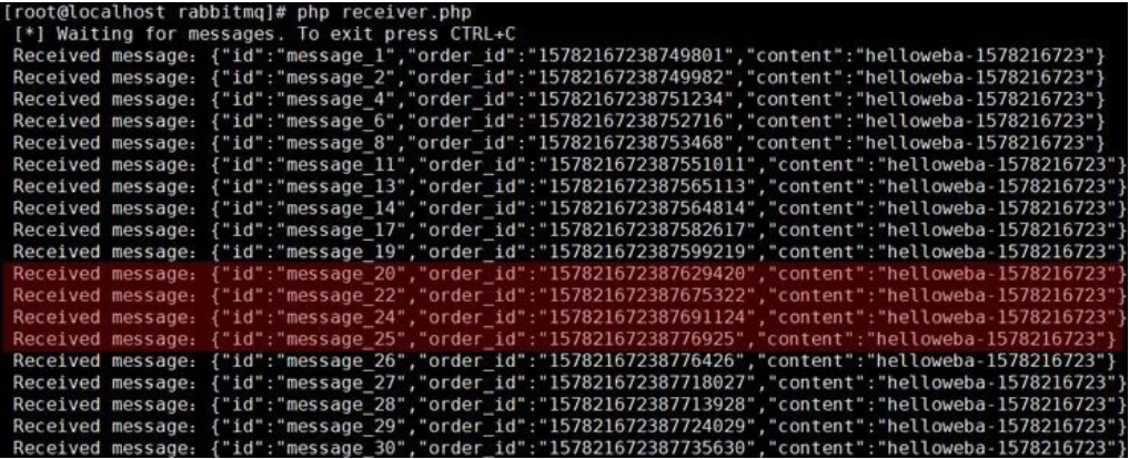 ?>上述代码中,我们模拟了生产者向队列中发送了100条订单消息。