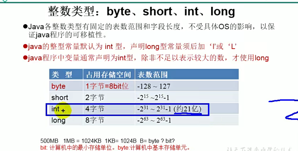 整型:byte【1字节】 short 【2字节】 int 【4字节】 long【8字节】