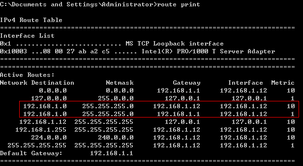 Windows(2003)系统下的静态路由与直连路由优先级对比: