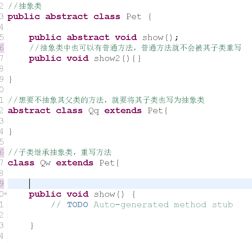 如果抽象类是父类,那么其子类必须重写他的抽象方法 除非没有抽象类中没有抽象方法或其子类也是抽象方法。