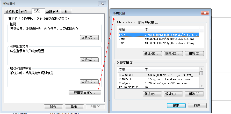 修改PATH变量,安装nodejs时已新增,其后面的路径更改为自己新建全局安装文件夹时的路径。