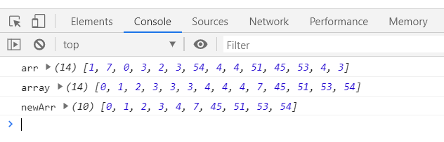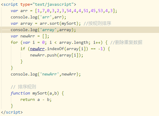 var arr = [1,7,0,3,2,3,54,4,4,51,45,53,4,3]; console.log('arr',arr); var array = arr.sort(mySort); //按规则排序 console.log('array',array); var newArr = []; for (var i = 0; i < array.length; i++) { //删除重复数据 if (newArr.indexOf(array[i]) == -1) { newArr.push(array[i]); } } console.log('newArr',newArr); // 排序规则 function mySort(a,b) { return a - b; }