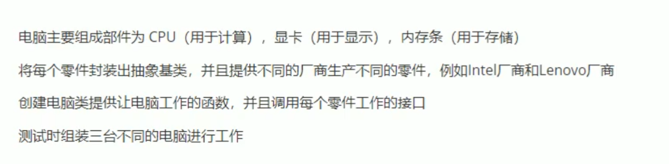 class Abstract_CPU { public: virtual void Calculate() = 0; Abstract_CPU() { cout << "Abstract_CPU的构造函数" << endl; } virtual ~Abstract_CPU() { cout << "Abstract_CPU的析构函数" << endl; } }; class Abstract_GPU { public: virtual void Show() = 0; Abstract_GPU() { cout << "Abstract_GPU的构造函数" << endl; } virtual ~Abstract_GPU() { cout << "Abstract_GPU的析构函数" << endl; } }; class Abstract_Memory { public: virtual void Storage() = 0; Abstract_Memory() { cout << "Abstract_Memory的构造函数" << endl; } virtual ~Abstract_Memory() { cout << "Abstract_Memory的析构函数" << endl; } };