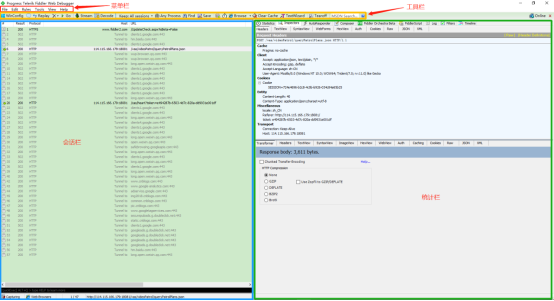 在会话栏界面中可以看到Fiddler抓取的所有HTTP请求,而为了更加方便的管理所有的session, Fiddler提供了一系列内置的函数用于筛选和操作这些session,输入命令的位置在web session管理面板的下方,通过快捷键Alt+q可以focus到命令行。