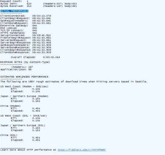 详情和数据统计面板。针对每条http请求的具体统计(例如发送/接受字节数,发送/接收时间,还有粗略统计世界各地访问该服务器所花费的时间)和数据包分析。