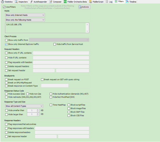过滤器面板。以设置Fiddler的过滤规则,来达到过滤http请求的目的。过滤内网http请求而只抓取internet的http请求,或则过滤相应域名的http请求。Fiddler的过滤器非常强大,可以过滤特定http状态码的请求,可以过滤特定请求类型的http请求(如css请求,image请求,js请求等),可以过滤请求报文大于或则小于指定大小(byte)的请求。