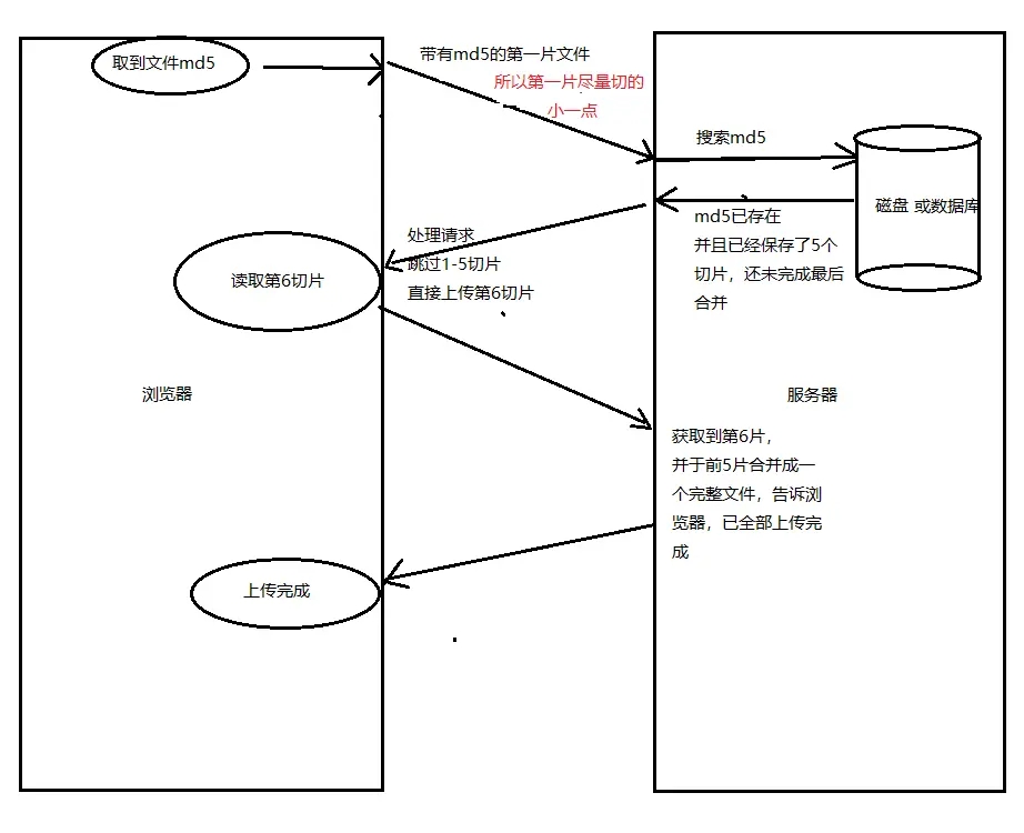 总结:有了切割上传,有了文件唯一标识信息(文件md5)断点续传只不过是后台的一个小小的判断逻辑而已。