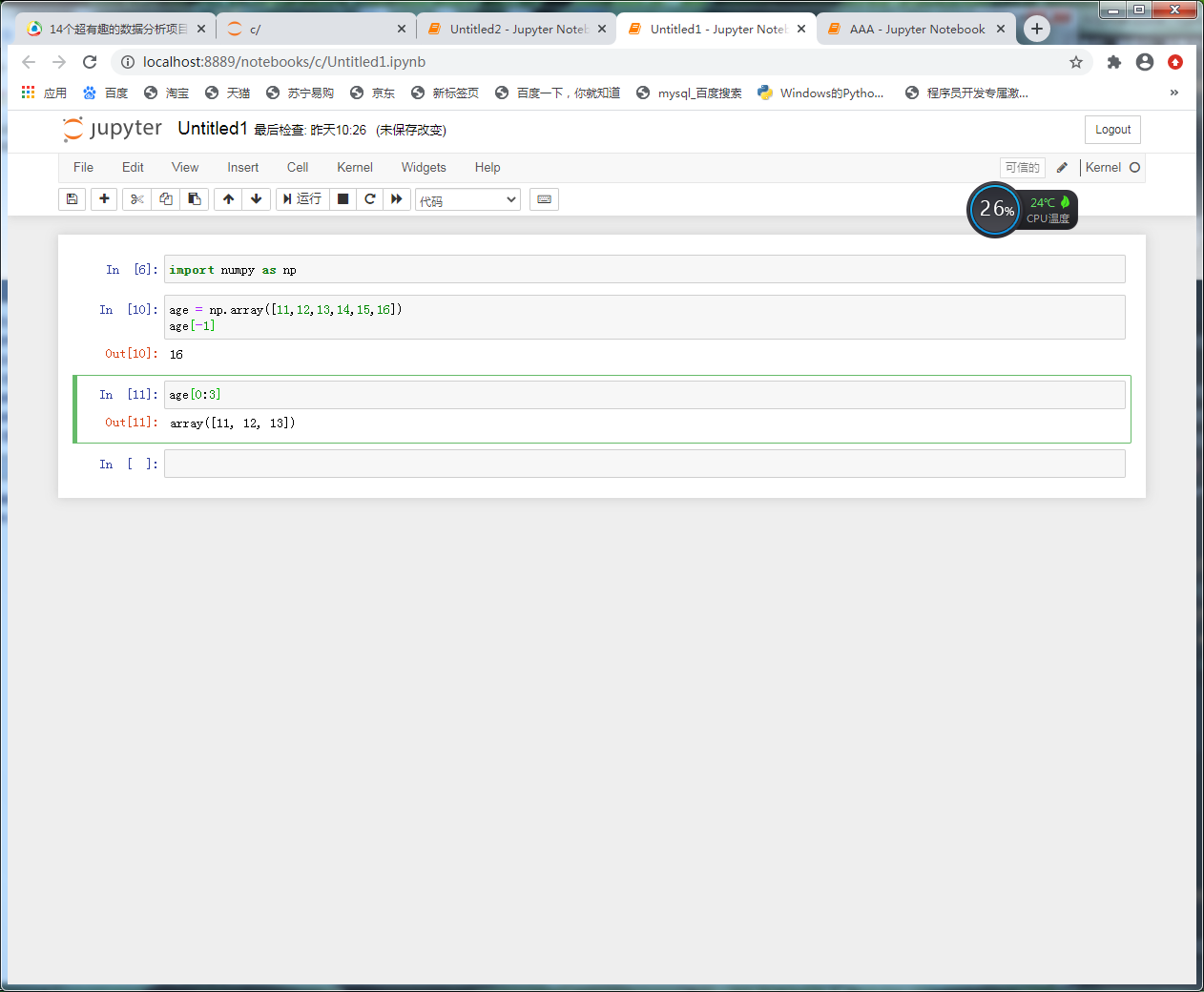 在一维数组中,可以使用列表的所有方法,并且还可以额外使用间断索引(花式索引)和逻辑索引