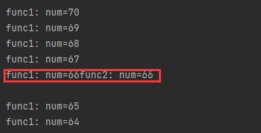 如图所示,2个线程同时访问了全局变量num,所以都输出变量值为66。
