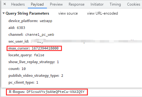 对比各页请求发现只有max_cursor 和 X-Bogus 这2个参数发生变化,