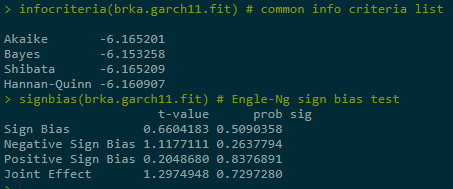 infocriteria(brka.garch11.fit) # common info criteria list signbias(brka.garch11.fit) # Engle-Ng sign bias test