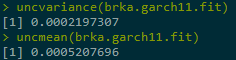 uncvariance(brka.garch11.fit) # unconditional long-term var uncmean(brka.garch11.fit) #unconditional long-term mean