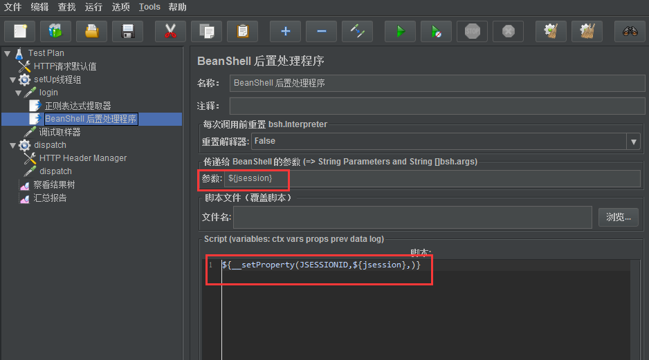 - 确认cokkie取值正确后,在登录请求下添加后置处理--BeanShel后置处理程序。将cookie值改为全局量,如图。