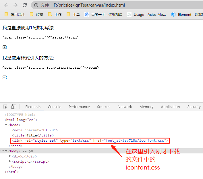 <!-- 这里的href路径要记得换成自己的路径 --> <link rel="stylesheet" type="text/css" href="font_ztktsv718x/iconfont.css"> </head> <body> <script> function createIconContent(text){ let span = document.getElementById('IconContent'); if(!span){ span = document.createElement("span"); p = document.createElement("p"); p.innerText = "我是用js动态生成标签写入Unicode编码显示出来的图标:" span.id = 'IconContent';