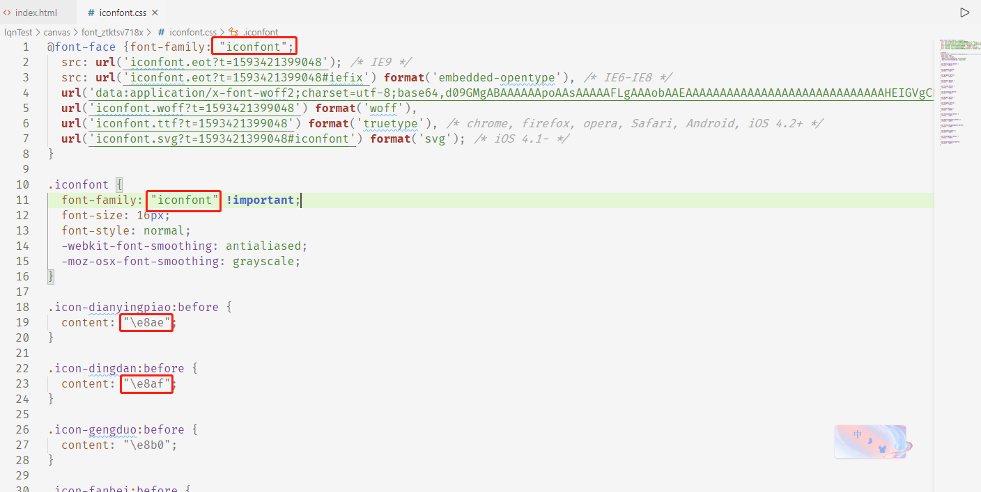打开iconfont.css文件,大家会看到@font-face的定义(关于@font-face详细,请点击)