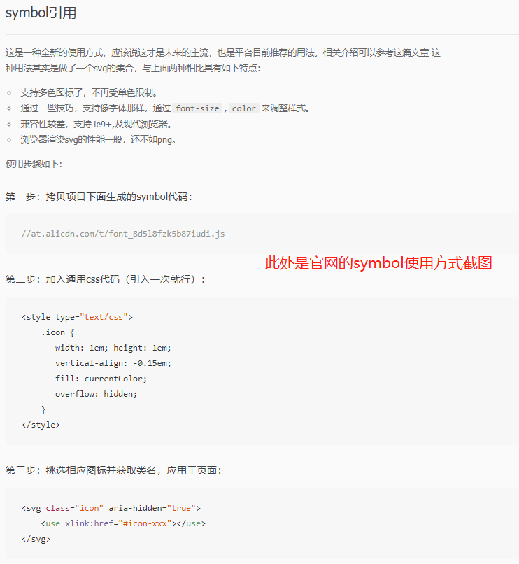 这个为什么单独拎出来说呢,因为这种使用方式是目前最推荐的使用方式先来看看iconfont官网中的说明: